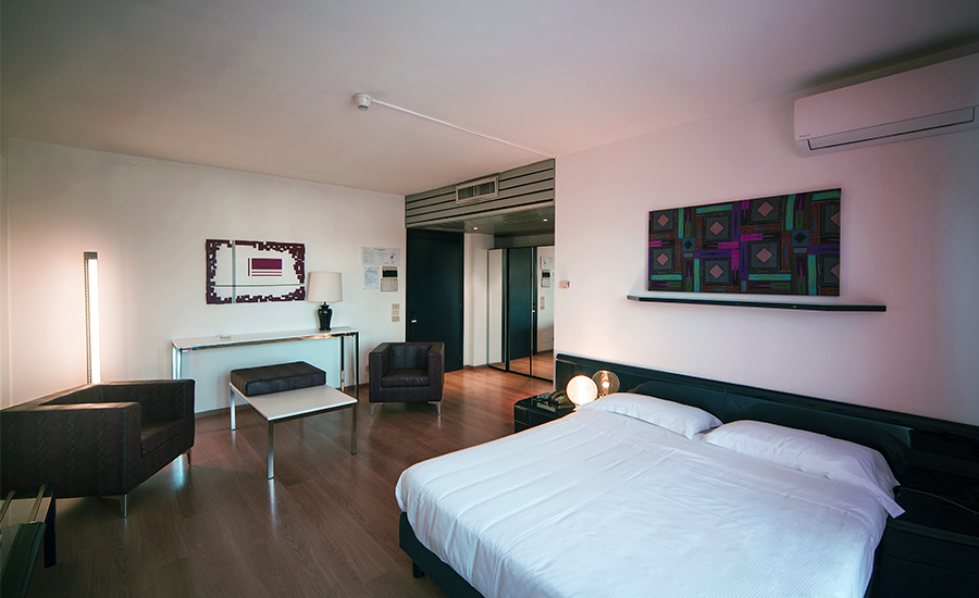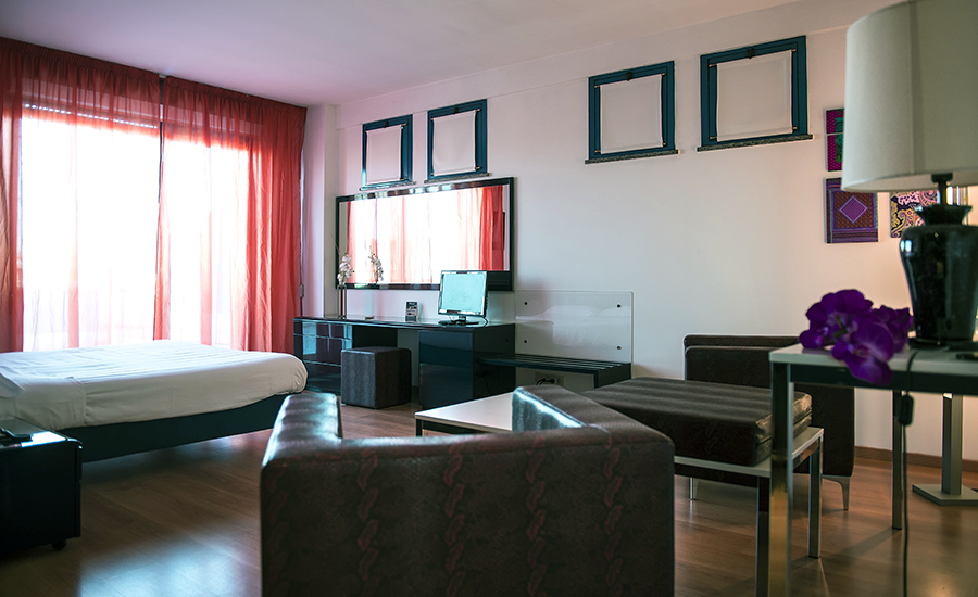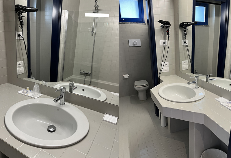 Double room with two single beds or one double bed , bathroom with bath or shower , hairdryer . Relaxation area with sofa and armchairs .